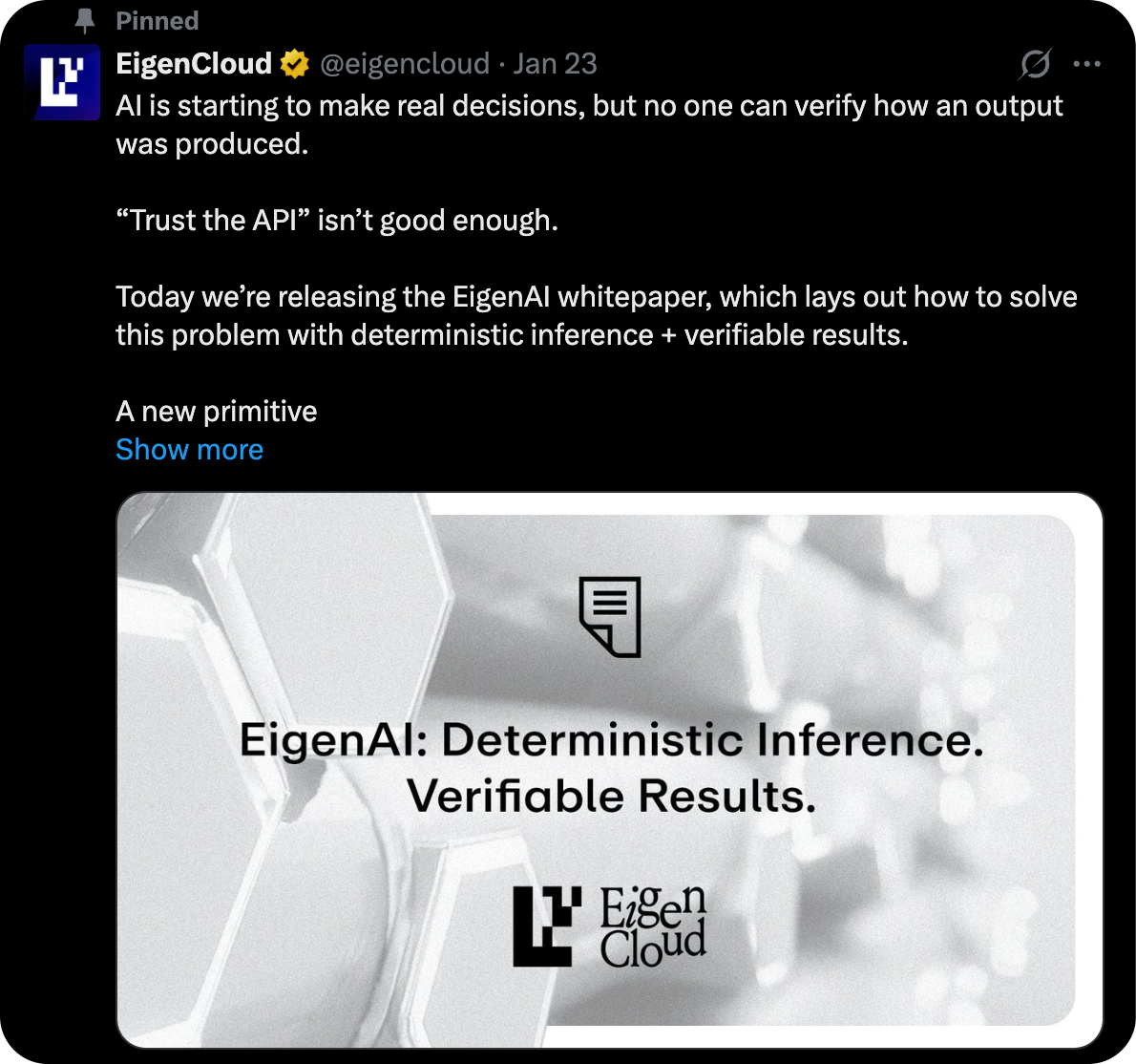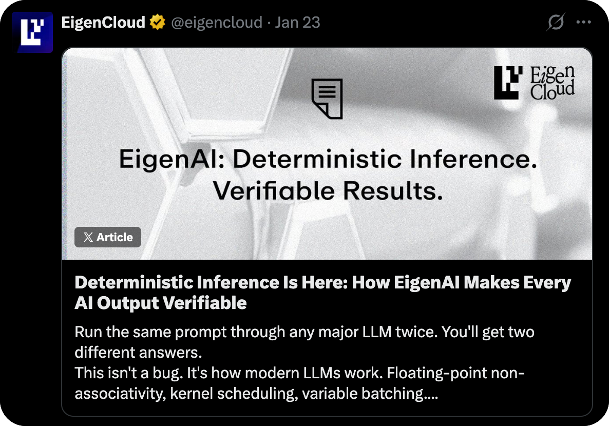 EigenAI's whitepaper suggests this gap is solvable. Deterministic inference is achievable with the right constraints: standardized hardware, custom libraries, controlled execution environments. The tradeoffs are manageable — a small performance hit for the ability to actually audit what an AI did.