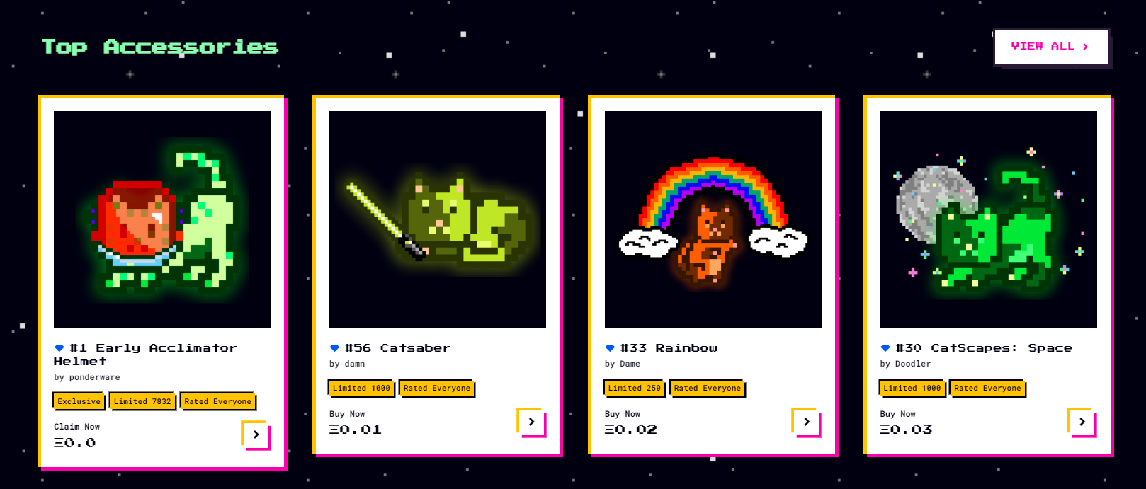 While accessories vary in their underlying uniqueness and corresponding value, an interesting aspect is that once bought, they will stay with the associated MoonCat and cannot be transferred or sold independently. Collectors can, however, choose whether theyâd like to display or hide their accessories at any time.