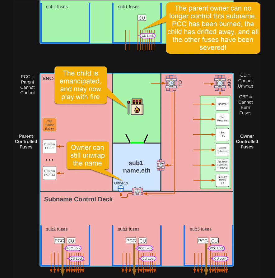 Again, a “fuse” represents one of the various permissions inherent to an ENS name. By burning a fuse, a name owner (a.k.a “parent”) can revoke certain permissions, such as making a subdomain NFT (a.k.a. “child”) nontransferable.
