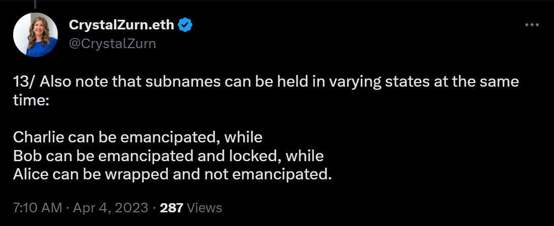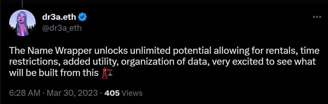 For instance, in “A Deep Dive Into the ENS Name Wrapper,” serenae.eth noted that one interesting option will be having the ability to bulk create subdomains and then drop the wrapped NFTs into other peoples’ wallets, e.g. your fellow DAO members or your NFT collection holders.
