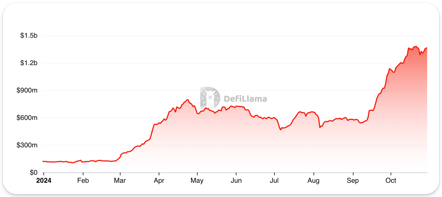 From day one, this “MetaDEX” has ranked as one of the most popular applications on the Base L2. The Protocol currently custodies $1.3B in TVL (50% of all Base smart contract deposits), and its AERO token has been a top-performing DeFi asset this fall – up 125% since the start of September.