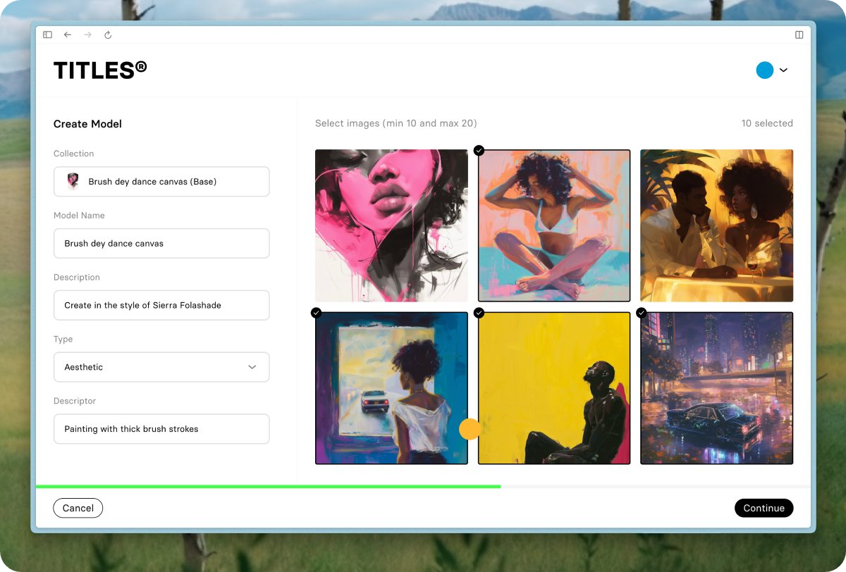 3. Select 5 to 20 NFTs to train your model on and finalize your model’s basic info—the more visually harmonious your selected inputs are, the smoother your model’s outputs will be, so curate thoughtfully