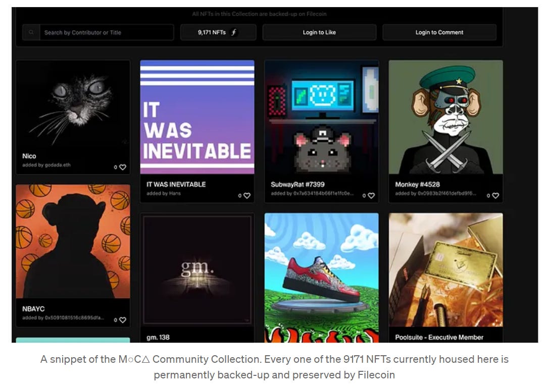 As for the Filecoin ecosystem, one notable example project that’s integrated the network as a storage solution is the Museum of Crypto Art. By using Filecoin and its FIL incentives, the crypto-native museum has doubled down on backing up its digital art collections for posterity.