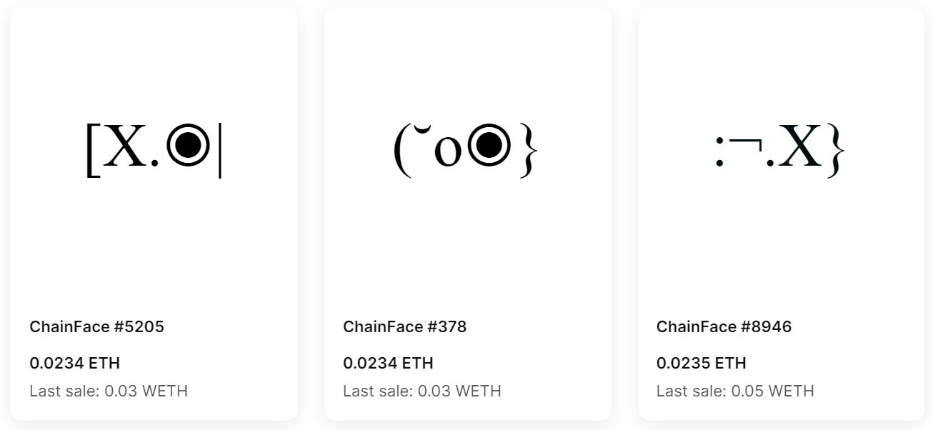 Yet it’s not just nostalgia that makes me love ChainFaces. These 9,999 unique ASCII text faces are among the first generative art releases in NFTs, and they’re also the very first fully onchain profile picture (PFP) collection, with this design having inspired dozens of new projects in its wake.