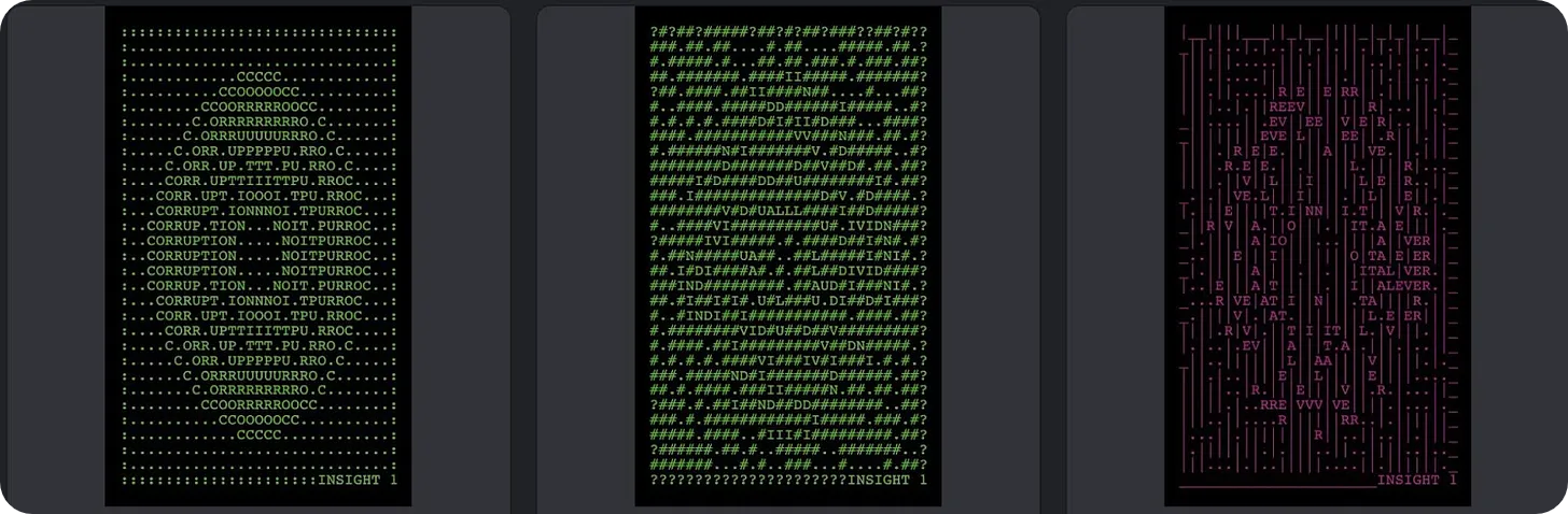 Corruption(s*) is an avant-garde cryptoart collection with a unique interplay of art and mechanics. In other words, each NFT in the collection is entirely onchain and features generative ASCII art that evokes textual portals, containing one of ten specific words like "CORRUPTION" or "EVERYTHING."