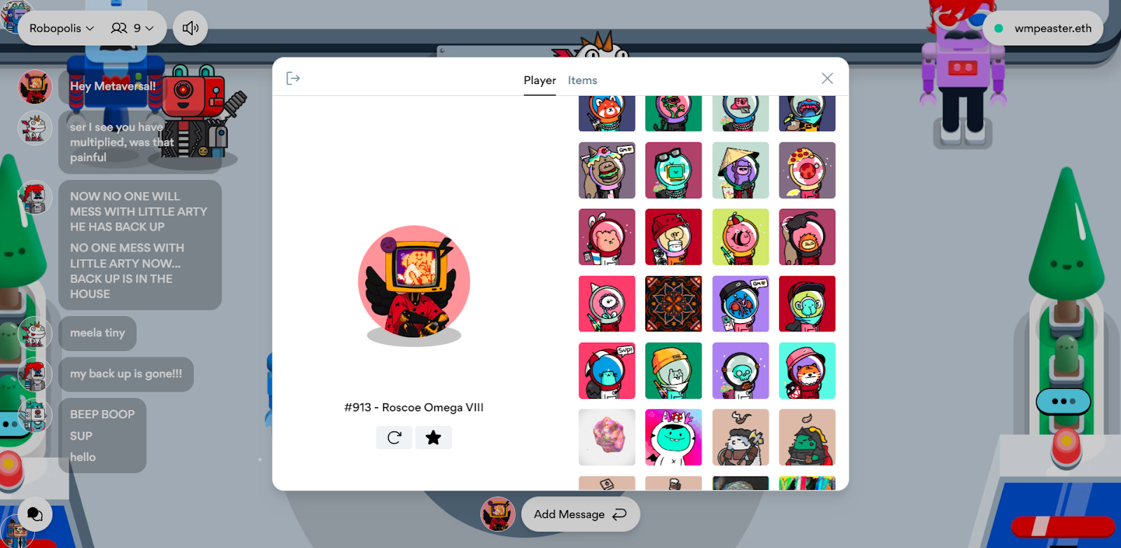 First things first, you can head over to microverse.bueno.art/robotos/robopolis, at which point you’ll be prompted to connect your wallet of choice and then select your “player,” or which NFT from your wallet you want to represent you in-world. For instance, as seen in the image above I proceeded with my favorite Blitnaut for my avatar!