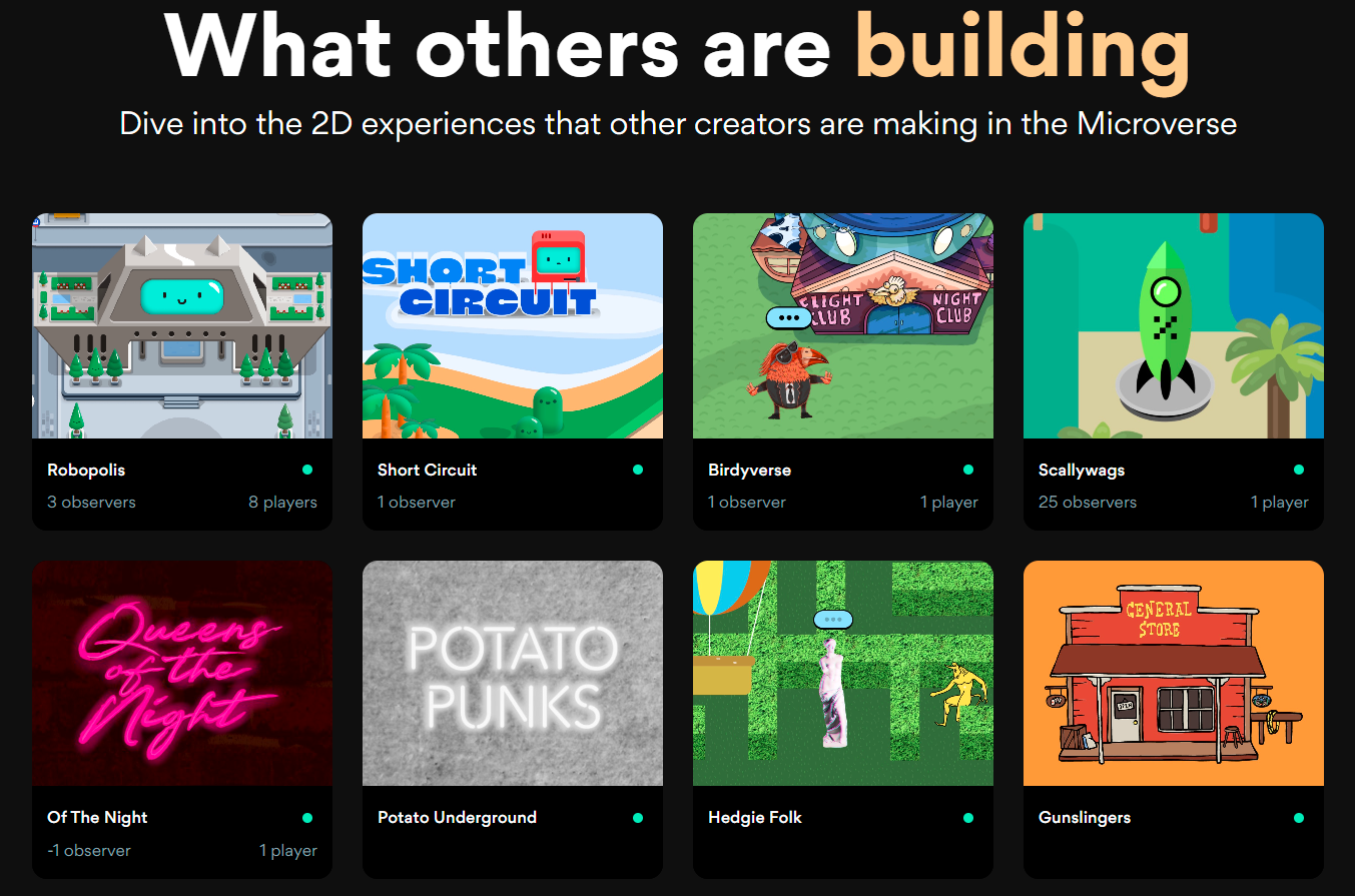 As for principles, The Microverse currently optimizes for serendipity (“you had to be there to live it”), familiarity (“gravity, matter, presence, time, etc.”), funness (“the tools are light and easy, so the games created are fun and experimental”), intimacy (“like a gig at a small venue”), and limitlessness (“expand on your worlds without limits”).