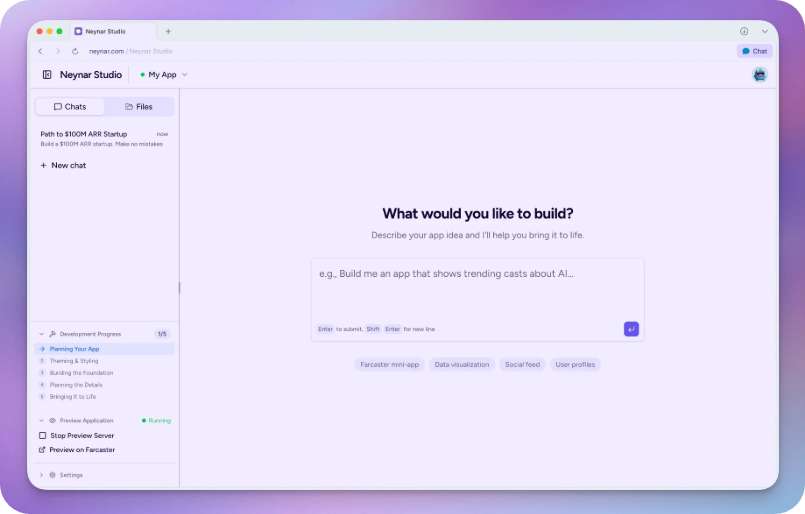 That said, a blocker here hitherto has been needing technical dev experience to build mini apps. Fortunately for all us creatives, Neynar, the new owners of Farcaster, just rolled out Neynar Studio on Web.