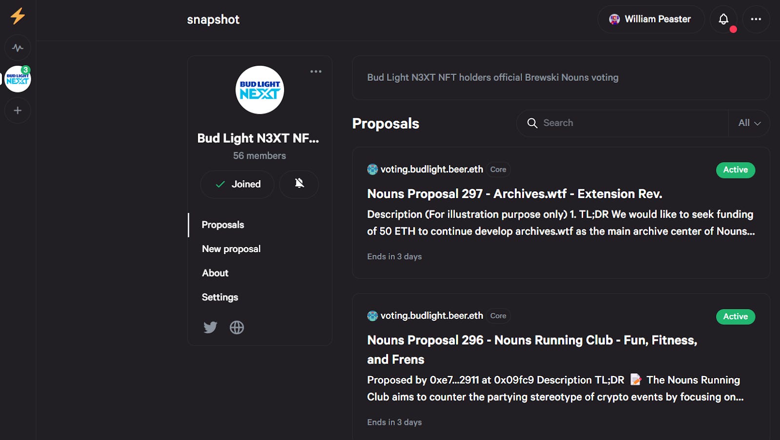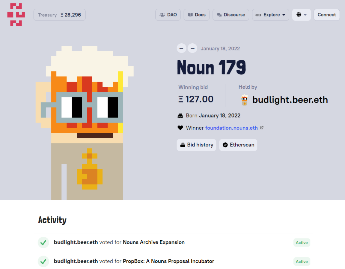 If you do make the leap in, note that you vote on how Noun 179 votes using Snapshot whenever there are active proposals. You can also get notified of proposals or discuss them with others in the “nounsdao-proposals” and “proposal-workshop” channels in the Bud Light Discord.