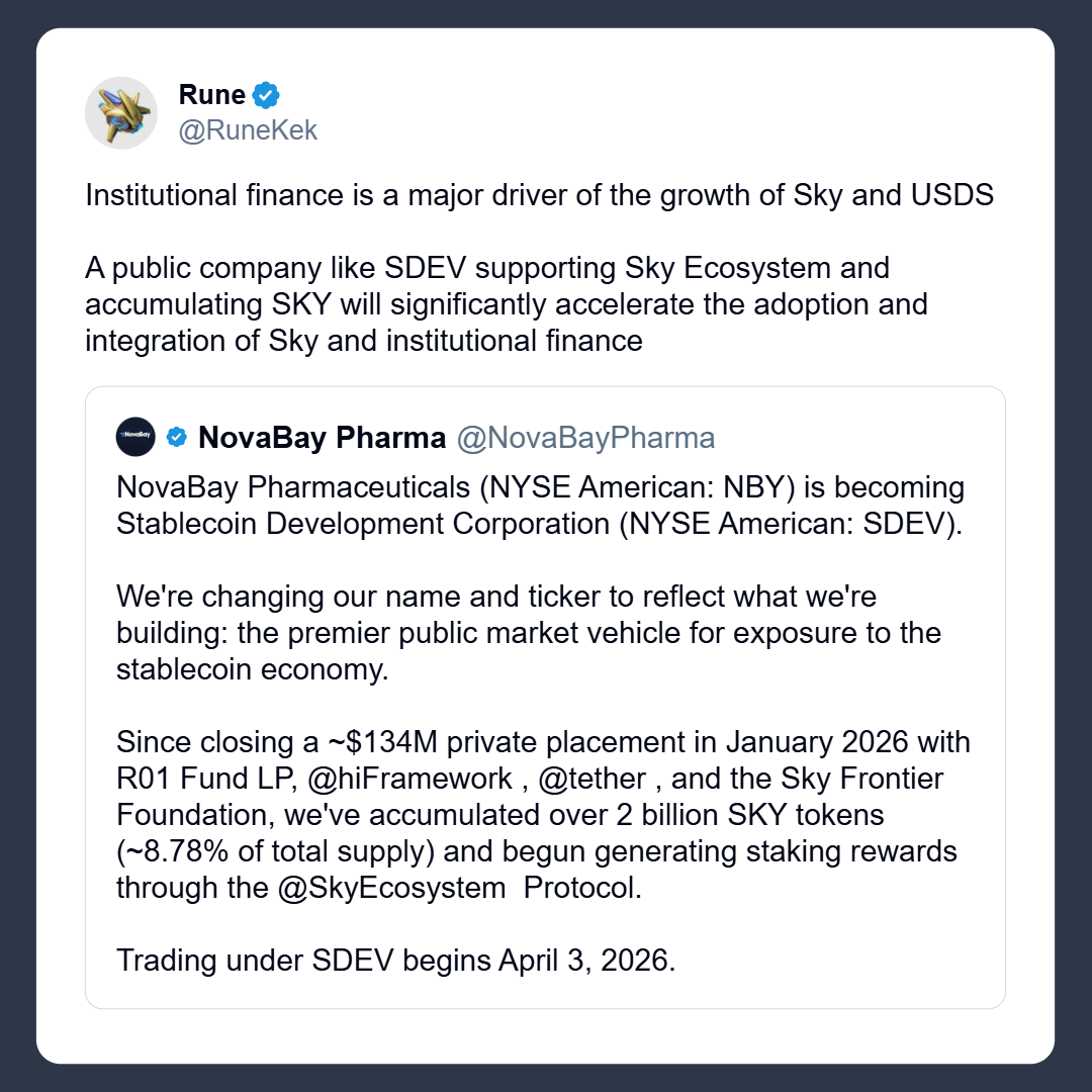 - The Pivot: The company, formerly NovaBay, disclosed it now holds more than 2 billion SKY tokens, or roughly 8.8% of total supply (~$150 million). The tokens were acquired through open-market purchases and a $134 million January private placement backed by Framework Ventures, Tether Investments, and Sky Frontier Foundation. SDC has begun staking the holdings, having earned ~26.6 million SKY tokens in rewards so far.