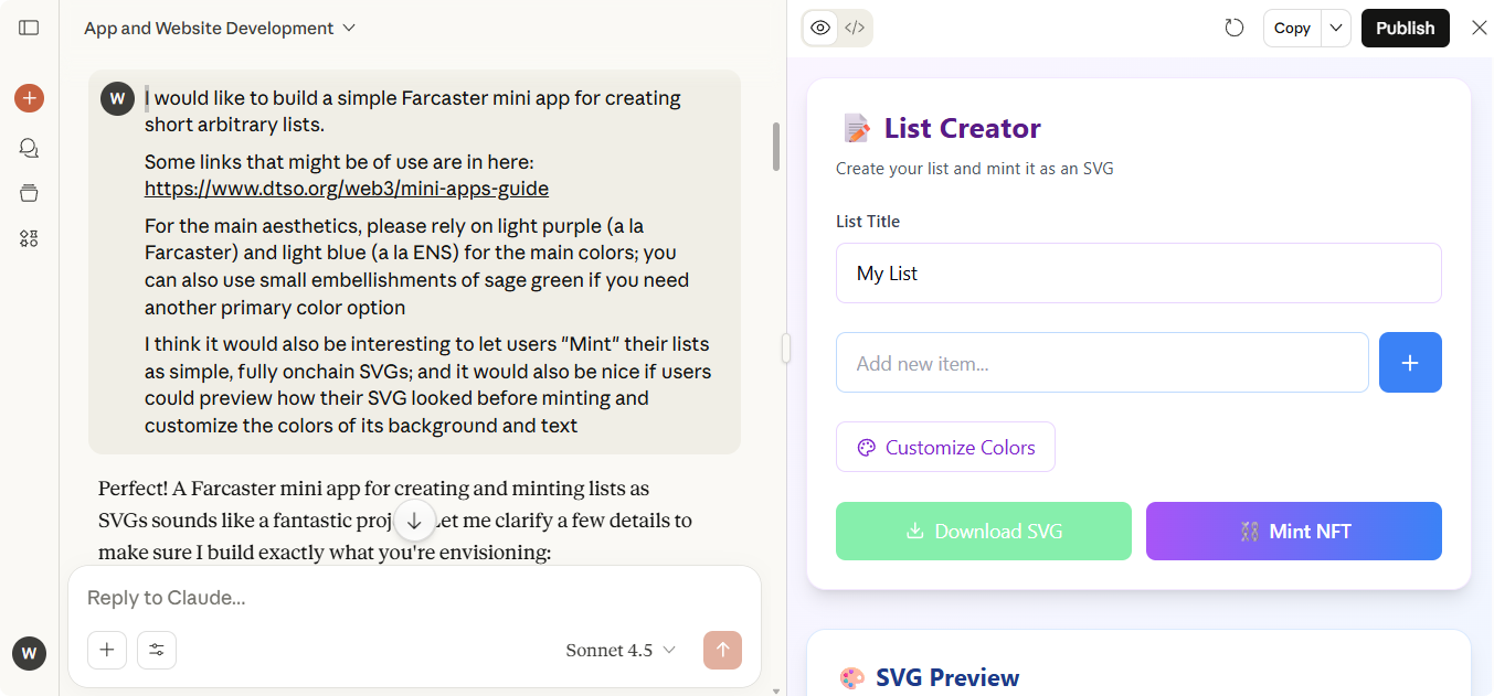 I was recently experimenting with trying to create a Farcaster mini app. I'm not a developer, so one of the resources I explored was Claude Artifacts, which is an AI-powered no-code app builder. It was great for visually mocking up ideas and getting code for interfaces, like so: