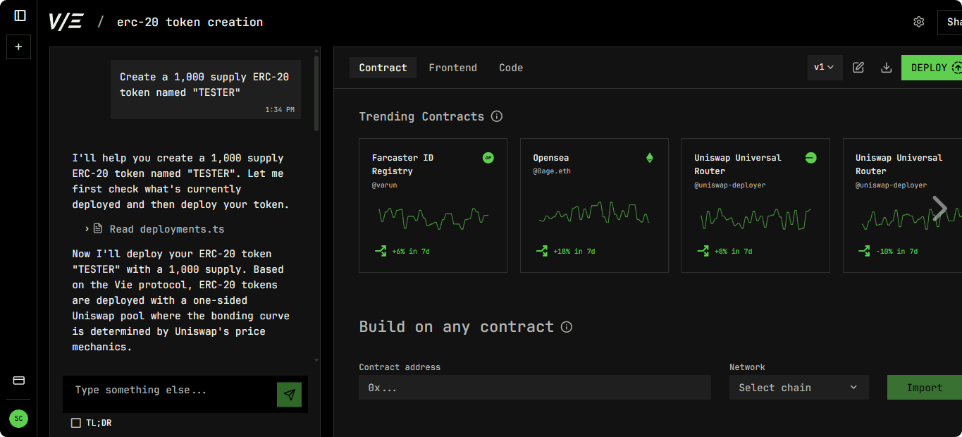 And what's nice about Vie is that it doesn't just give you the frontend code, like Claude. Instead, it can deploy frontend code and the underlying smart contracts for you, while also handling hosting and wallet authentication. All through text prompts, and in seconds!