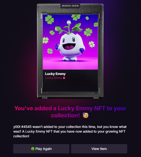 Conversely, if you don't win your target NFT, the SOL you committed will be gone. However, as a consolation, any time your Lucky Buys miss you'll receive a non-transferable Lucky Emmy NFT, and these help boost eligibility in Magic Eden's rewards program.