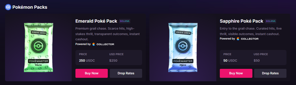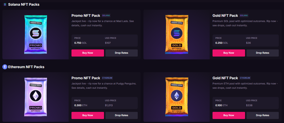 Yet there's not just Pokémon cards to choose from here, either. Magic Eden has taken this same packs approach and applied it to Ethereum and Solana NFT collections. However, there are some notable differences.