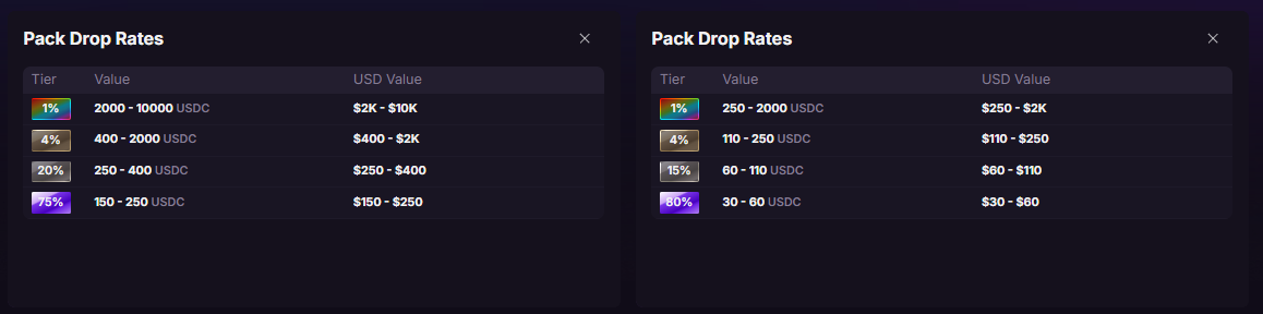 Of course, firstly, instead of USDC you pay with ETH or SOL for these NFT packs. And sellback payouts for these pulls are either 90% of the pulled NFT's floor price or 101% of that collection's top offer, depending on which is higher.
