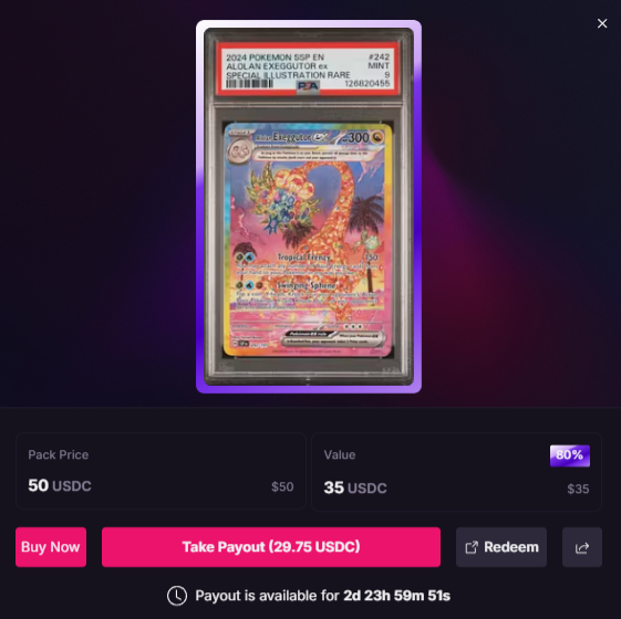 The biggest difference, though, is the sellback window period. Instead of the Pokémon packs' 72 hours, you have 5 minutes to decide whether you want to receive the NFT you pulled or the instant payout.