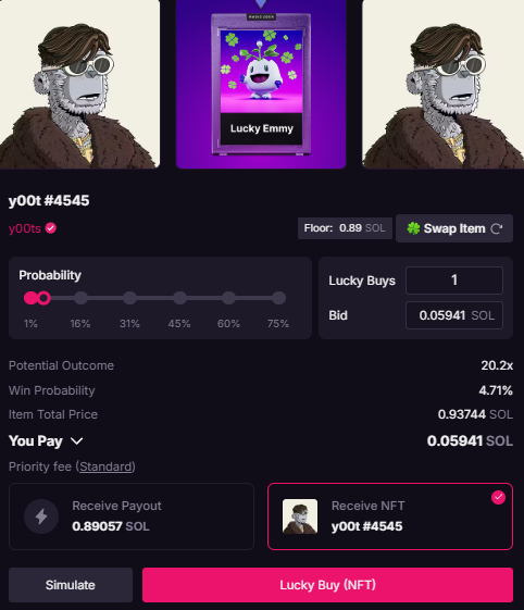 You can press the "Simulate" button to test out some spins first with nothing at stake. If you decide to officially try, press the "Lucky Buy" button and confirm the purchase with your wallet. Magic Eden will run a verifiable randomness function (VRF) onchain to decide the outcome. If your attempt hits, you can keep the NFT or choose "Payout" to receive 95% of the NFT's value in SOL.