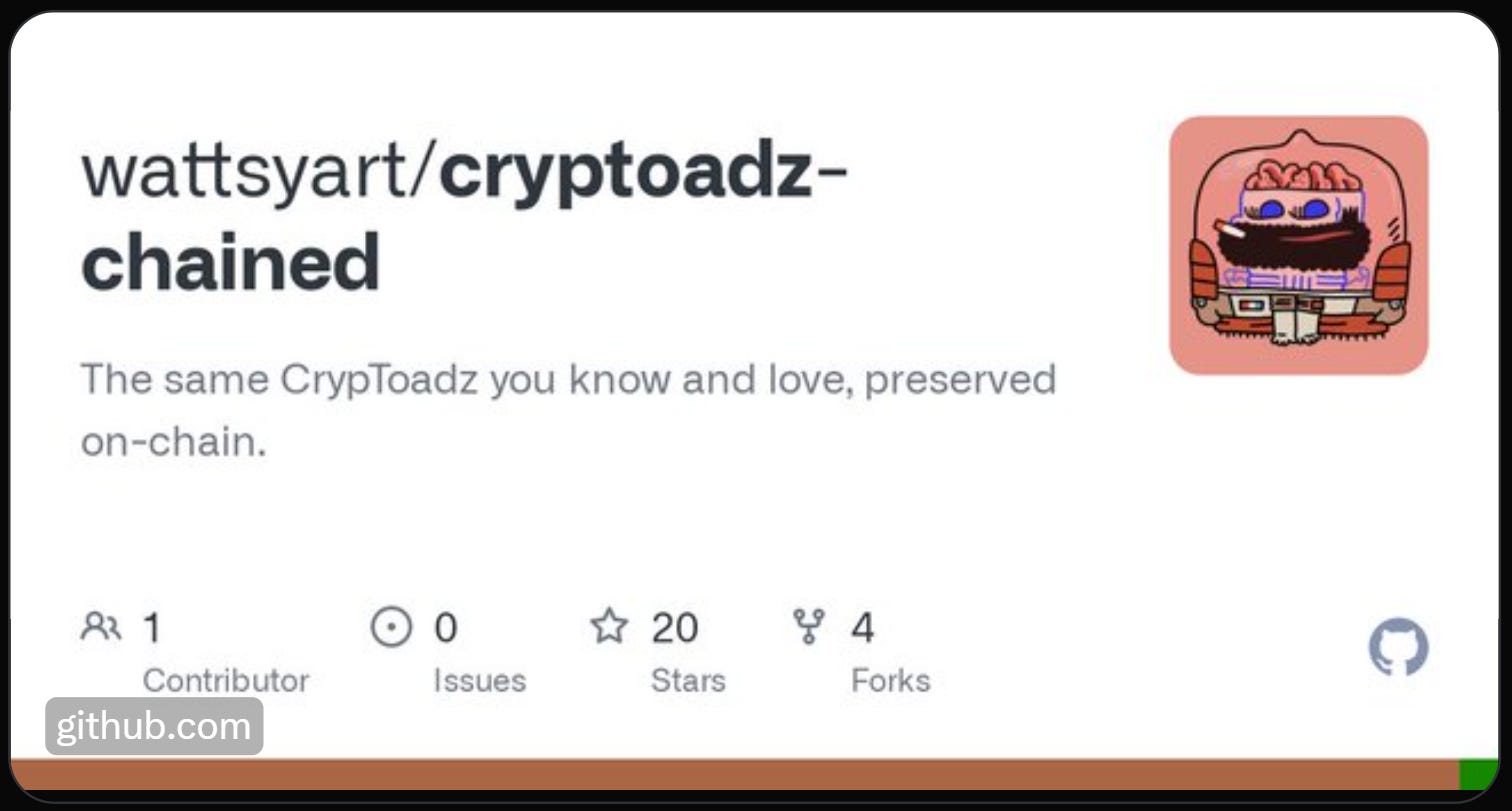 This hybrid approach happens when a project is retroactively brought onchain. In other words, letâs say a collectionâs original smart contract stores its media externally. Then later the project decides to deploy the collectionâs media in a new, separate smart contract to officially archive it onchain. The original contract and the subsequent contract arenât connected directly, but practically speaking they come to live side by side. Examples of projects that have performed this effort are CryptoPunks in 2021 and CrypToadz in 2022.