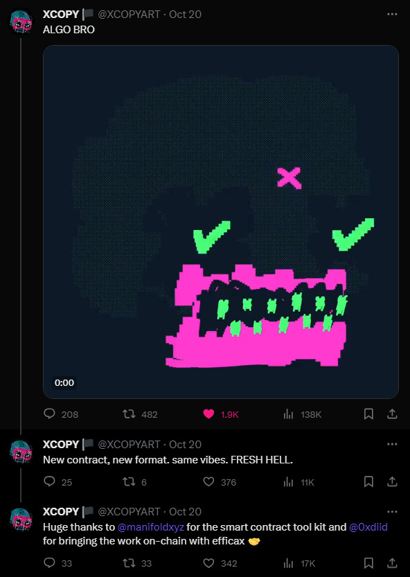 Now, though, there are some no-code resources available that creatives can tap if they want to readily mint stuff onchain. For instance, Indelible Labs is one tooling suite that specifically makes it straightforward to drop large NFT collections onchain. A newer release here to note is Efficax by diid, a streamlined interface that allows you to mint fully onchain ERC-1155 NFTs on Manifold.