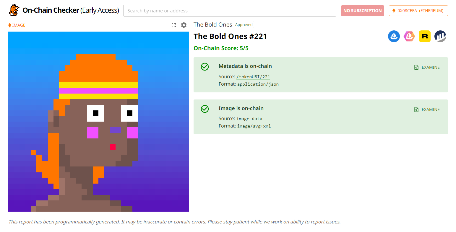 Zooming out, if you want to get a better sense of the range of onchain projects weâve seen in NFTs to date, check out the Onchain Canon, a great repository that was collectively curated during my time at JPG. Another resource to keep an eye on here going forward is On-Chain Checker by tokenfox. In early access for now, the platformâs designed to help you get an idea for just how onchain a given collection is using a five-point scoring system.