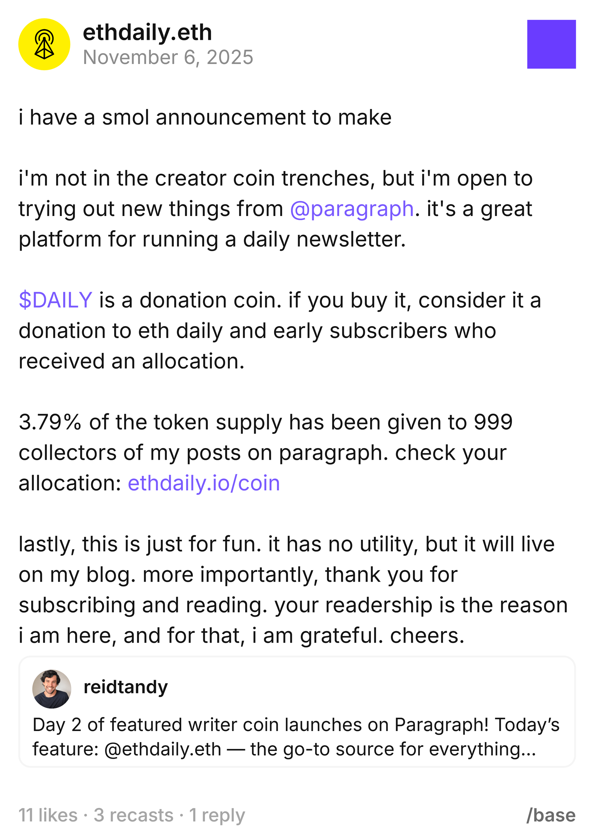 In July 2025, Paragraph introduced post coins.