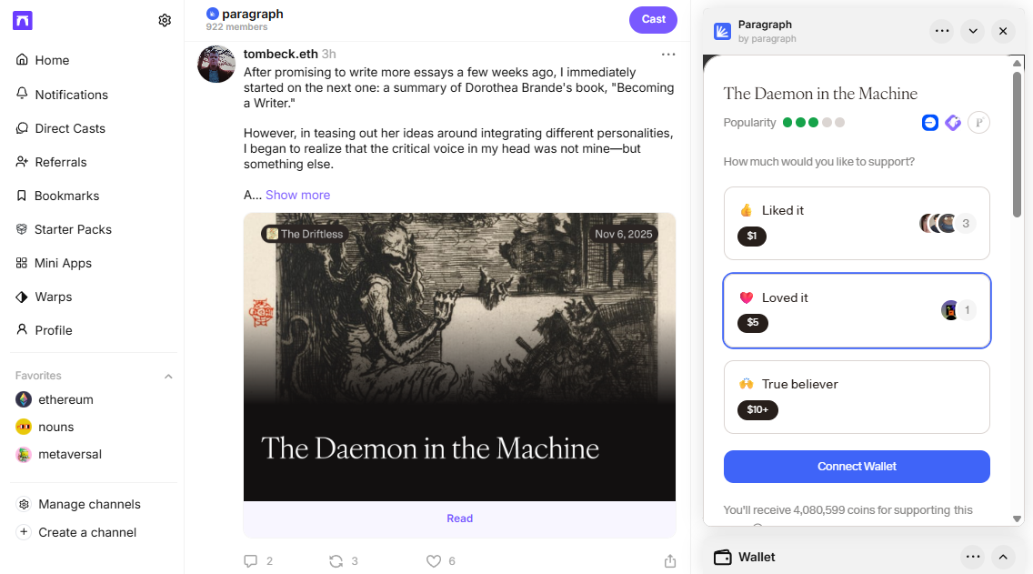 That said, another composability avenue here is how the Paragraph team built a mini app for Farcaster's onchain social network.