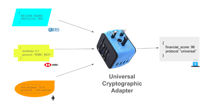 Specifically, 0xPARC researcher gubsheep has conceptualized the Universal Protocol, an adapter that would use cryptographic primitives (zkSNARKs, recursive zk, Multi-Party Computation, plus more theoretical mechanisms like Obfuscation) to translate and privately compose among any data sources, e.g. Xbox achievements, Overwatch ranks, ENS profiles, DeFi holdings, Twitter accounts, government IDs, credit reports, and so forth. None of these sources would need to share a common standard since this adapter would speak all their languages, as it were.