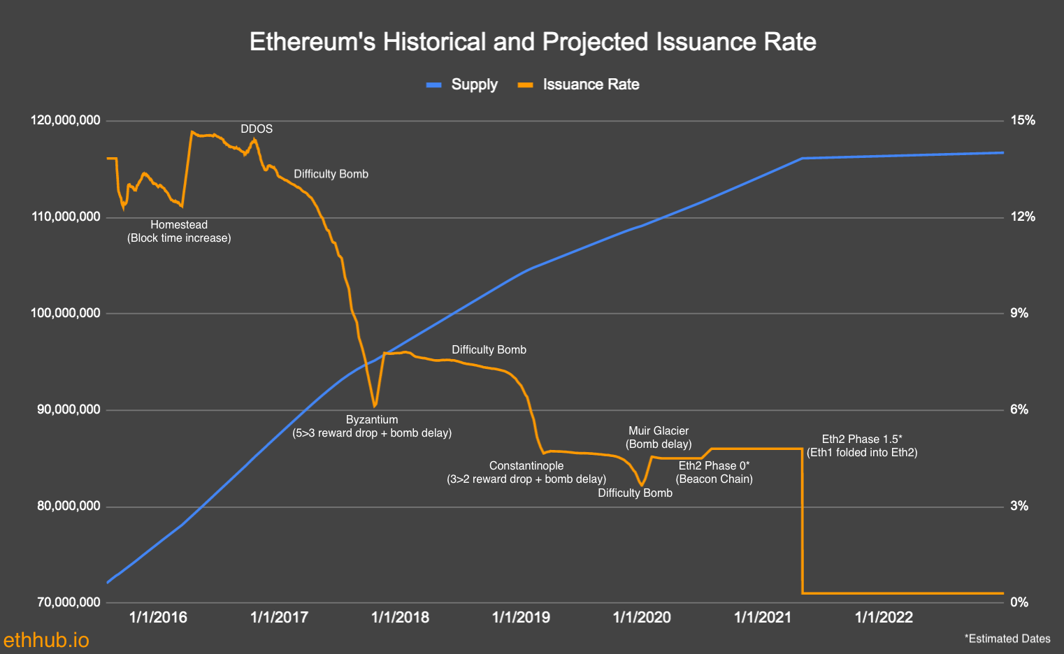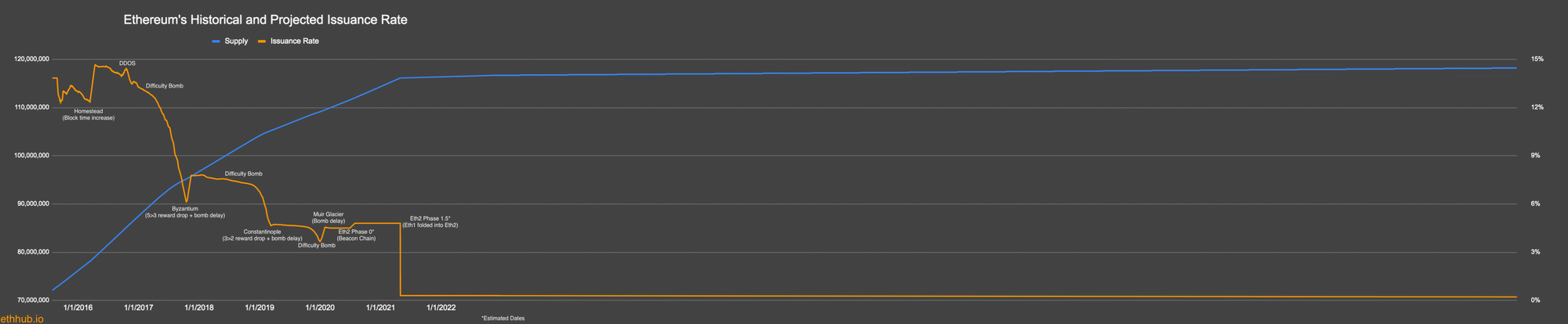 There have also been other protocol changes or impacts that have altered the rate of ETH issuance, but it’s important to note that the change in ETH issuance is a downstream result of other changes to the protocol, mainly around block times. These two forces, block times and ETH issuance per block, are the two reasons behind why the historical ETH issuance graph is choppy and undefined: