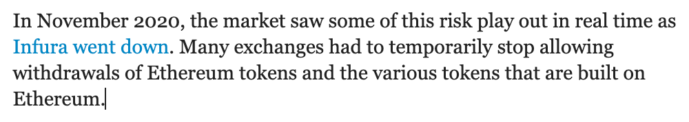 Lyn contends that Ethereum is heavily reliant on Infura to operate, and without it, many of the applications would fail to operate. There’s some truth to this. Infura is a crucial piece of infrastructure for ecosystem. However, when Infura went down in November 2020, only centralized exchanges and some other applications had problems. Ethereum continued to process transactions, users were able to swap tokens on Uniswap, etc. Simply put, despite the downtime, Ethereum kept working with minimal problems.