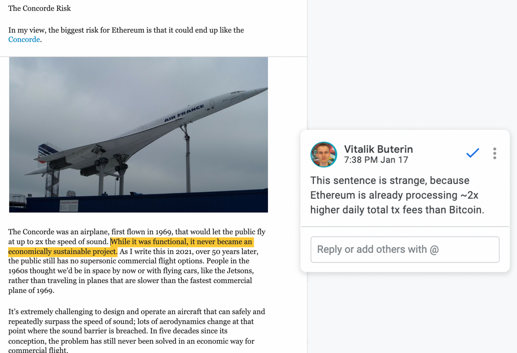 Lyn’s core argument here is drawing a parallel to The Concorde and that despite the technological innovation it brought to the airline industry, it doesn’t mean it will translate to economic sustainability or mainstream adoption. While the Concorde Risk can hold true for certain innovations, Vitalik argues that this doesn’t hold true for Ethereum.