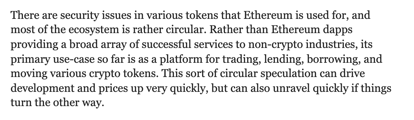 In this section, Lyn focuses on a qualitative analysis of the nature of the economic activity going on in Ethereum. She says that Ethereum is a “big operating system powered by crypto tokens for the purpose of moving around… crypto tokens”, basically implying: what’s the big deal?