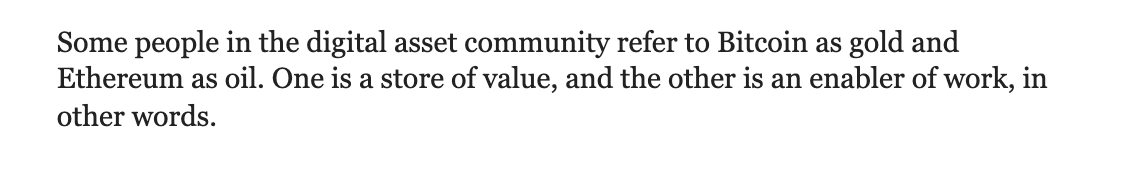Claim: BTC is digital gold, ETH is digital oil. ETH is an ‘enabler of work.