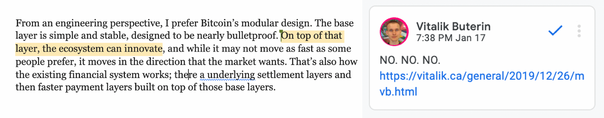 Lyn says that Bitcoin is simple and secure enough to offer the optimal platform for developers. It’s safe to say that Vitalik doesn’t agree and links his article, Base Layers And Functionality Escape Velocity. Here’s what he concludes in his piece: