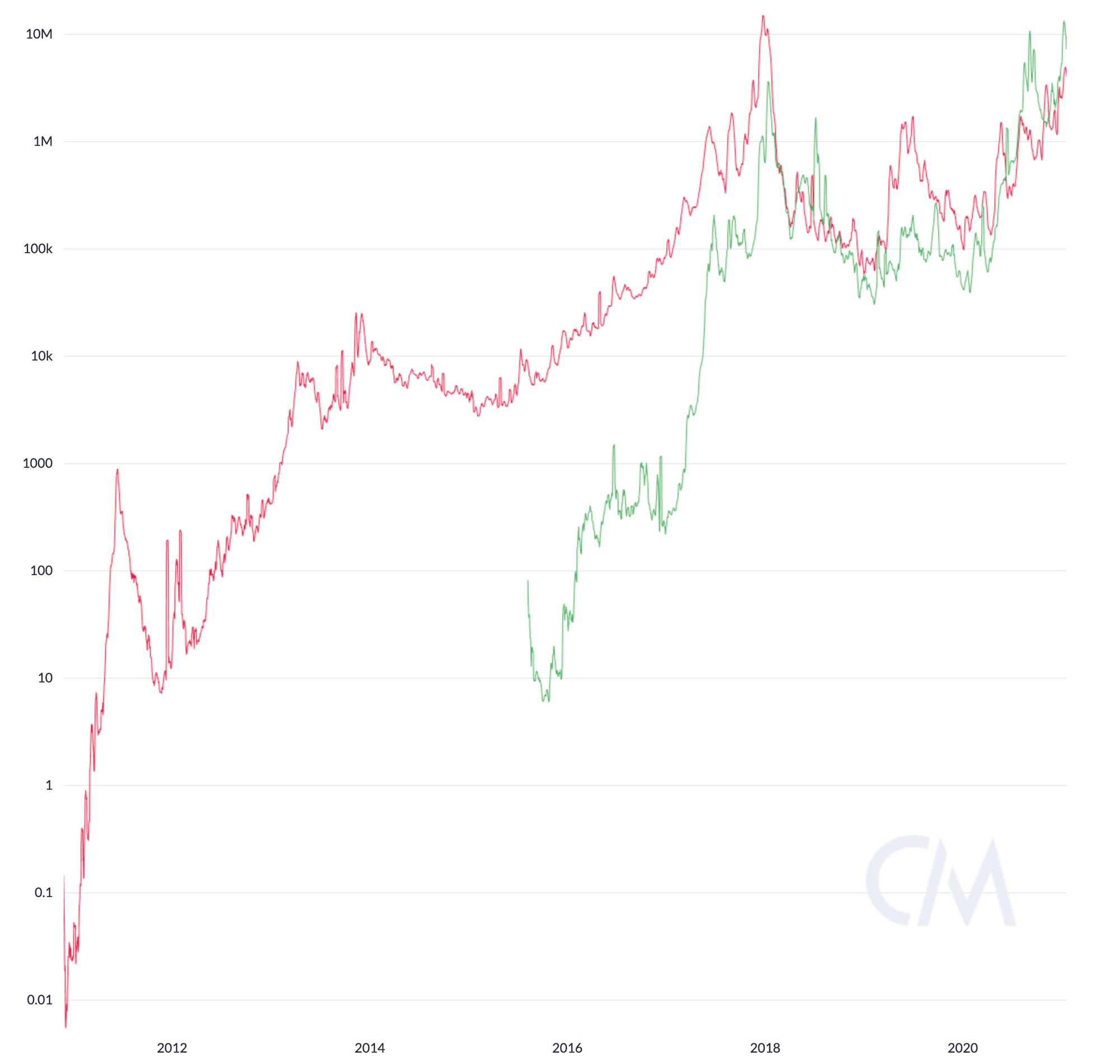 If we zoom into 2020, we can actually see Ethereum poking out ahead of Bitcoin and even sustaining that lead, as well as building 10-1 lead during certain periods.