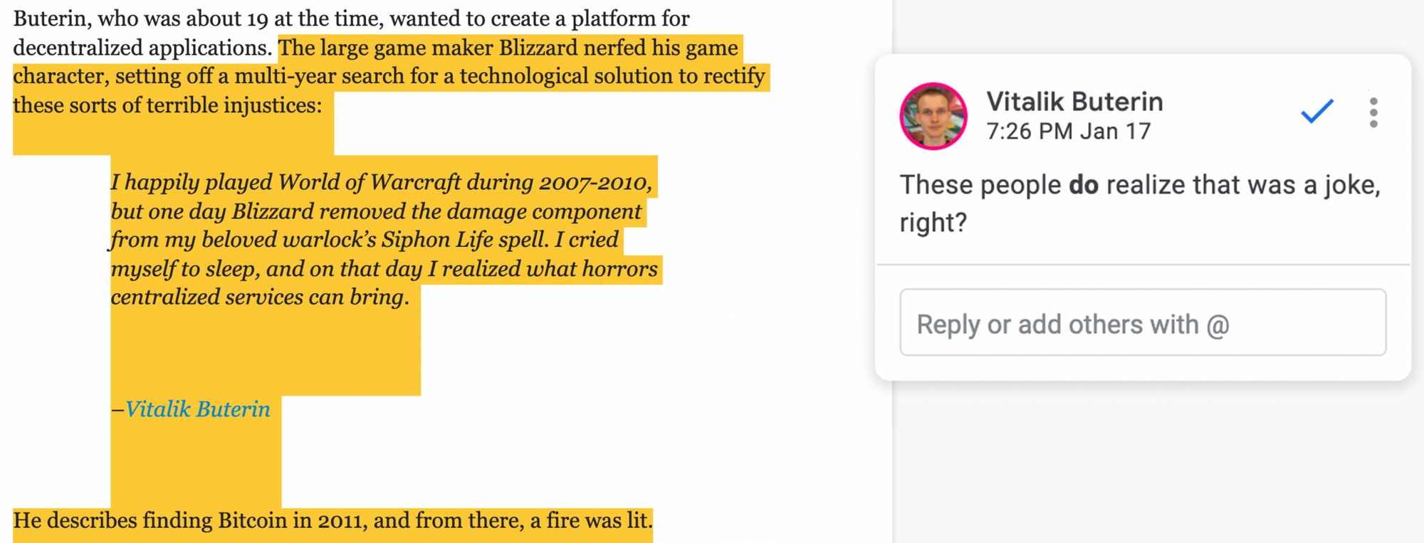 Alright, let’s start by clearing the air on this one. Despite what people have heard (us included), Vitalik’s motivation behind the creation of Ethereum was not actually getting his Warlock in WoW nerfed—that was a joke from his bio on his website. This isn’t really important to Lyn’s piece, so not really worth getting into. But it’s at least worth clarifying (mainly because Vitalik did).