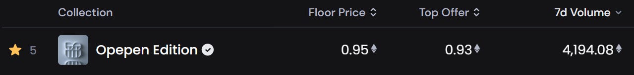 For comparison, the floor price of an unrevealed, āEdition Size: Fortyā Openen is presently trading around 0.9 ETH.