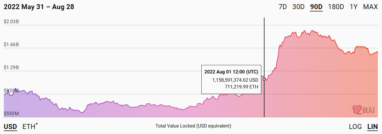 Since the start of August, total value locked (TVL) on Optimism has jumped by ~26%.