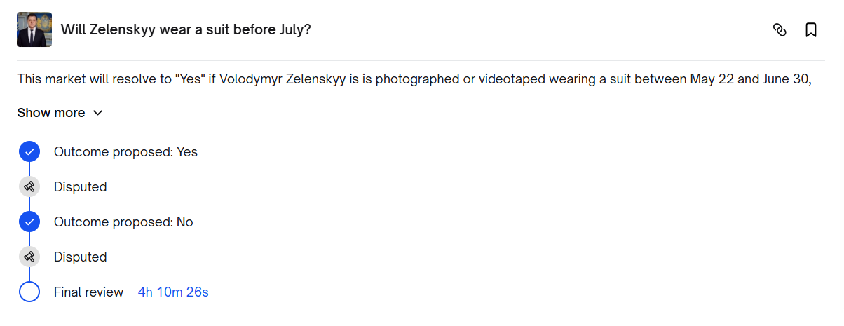 As such, someone opened a "Will Zelensky wear a suit before July?" market on Polymarket on May 22nd, 2025, with it running through June 30th. The market has done a whopping +$170 million in trading volume since then, but it's also descended into major controversy over the past week.