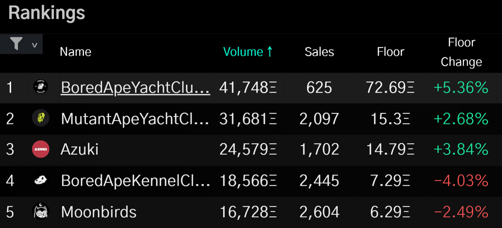 Last week, the leading blue-chip PFP collections contributed nearly 150k ETH to the NFT trading volume statistics. Among them, BAYC, MAYC, and Azuki experienced decent increases in floor prices, while MAYC, BAKC, and Moonbirds all recorded more than 2,000 sales over the week.