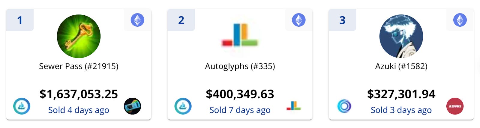 There were no sales of 'Punks or Apes in the top three largest transactions this week, but that wasn’t for a lack of major activity. On Monday, Fortnite esports professional and Yuga Labs's "Dookey Dash" competition winner Mongraal grabbed headlines and a major bag when he accepted a staggering Ξ1,000 bid for his top Sewer Pass key NFT!