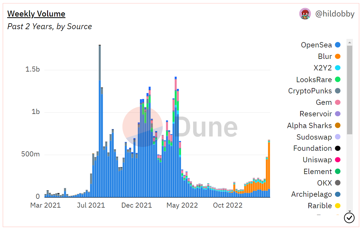 Once again, Blur continues to dominate NFT trading volume levels. According to the graph below, the platform currently represents roughly 80% of the ecosystem’s 7-day trading volume, with OpenSea trailing far behind at approximately 18%. This overwhelming activity on Blur is, of course, largely attributable to the ongoing scramble to earn $BLUR Season 2 rewards.