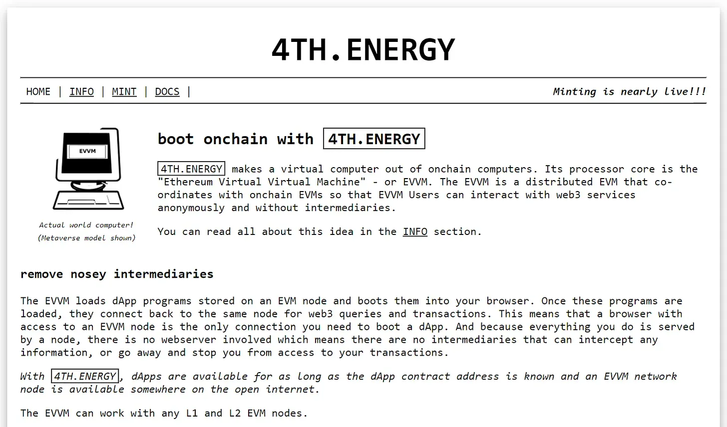 What if users could take control here, though? That was one of the thrusts of 4th Energy, which was ideated such that it would've allowed loading app frontends by booting them directly via NFTs rather than through web2 domains. In this system, NFTs would've acted as the entry point to a verifiable onchain “boot disk” holding apps' HTML, assets, and etc. This model would've let your browser load UIs straight from an Ethereum node and with no DNS or centralized servers in the middle.