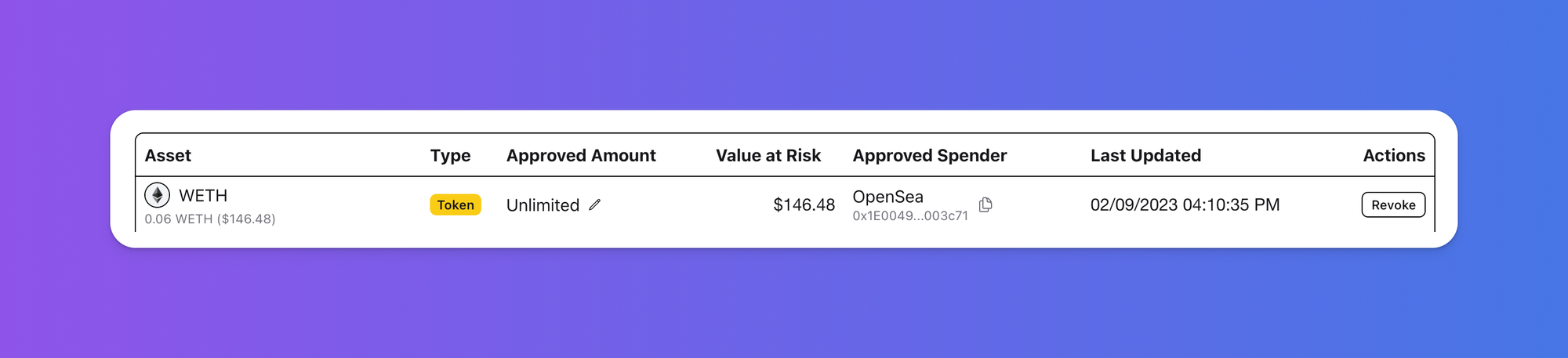 Identify any suspicious approvals and click 'Revoke' to cut them off. If you want to just limit access, click the pencil icon to adjust the approved amount.