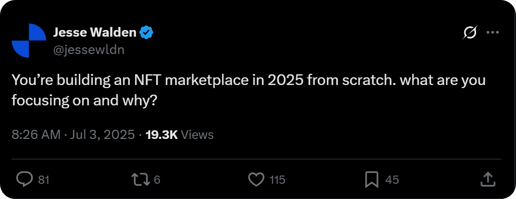 All that's to say, if I was building an NFT marketplace in 2025, I wouldn't build it as a marketplace per se. I'd try to make a new kind of broadly appealing social curation platform and cake a bespoke onchain NFT protocol within it that supports aggregation, listings, splits, mints, etc.