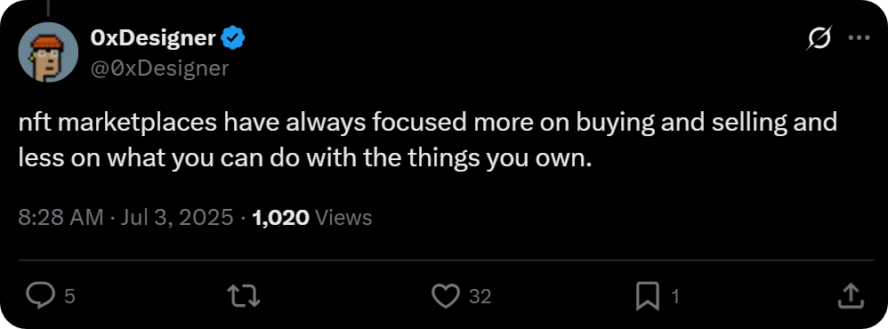 I agree with that line of thought. And I'd invert it if I was building NFT marketplace infra in 2025. In other words, I'd focus on offering cool stuff to do, and work backwards to buying/selling as supportive and secondary.