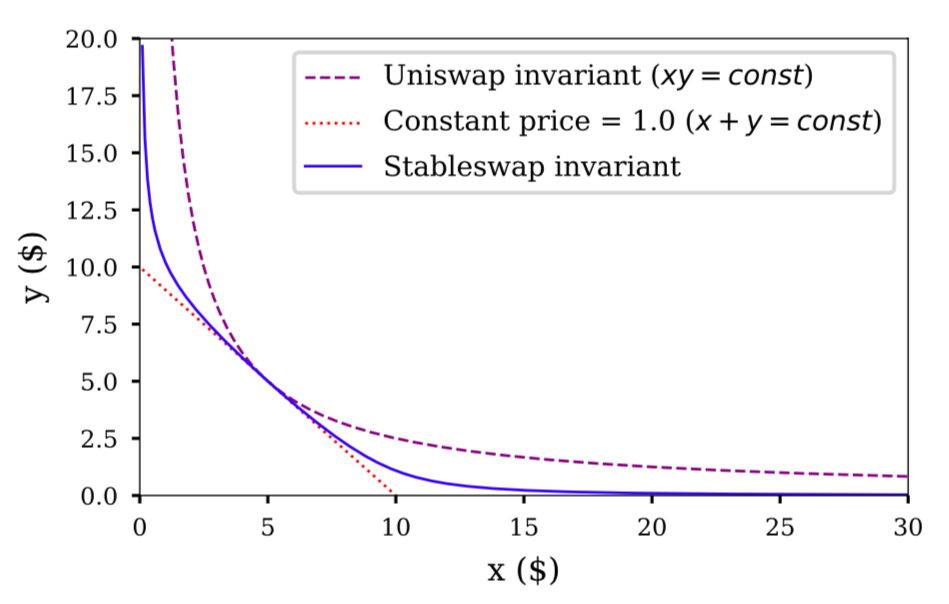 (Above) Bonding curves of Curve (aka StableSwap) vs. Uniswap