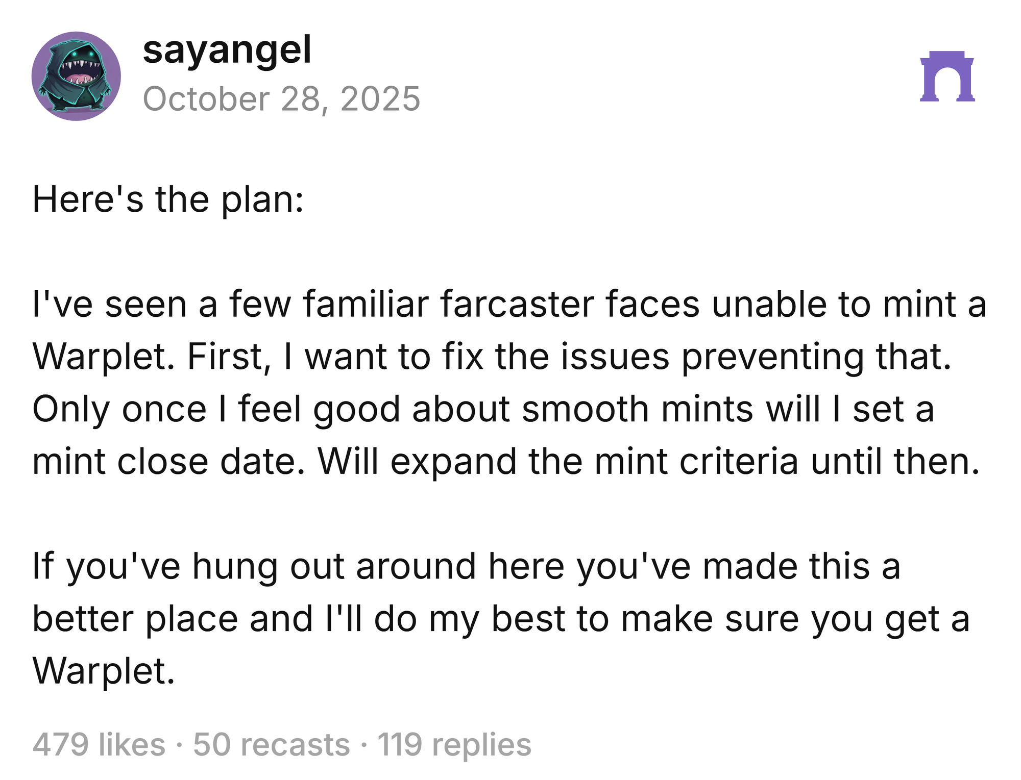 The mint itself has run into periodic hiccups, which led to a pause and reopening to Farcaster Pro subs early on. The drop is still open, but some users are having trouble with minting, so Say is working on fixes ahead of announcing a final close date.