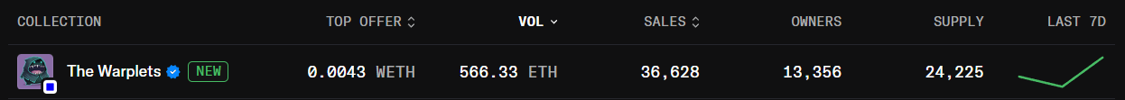 Additionally, the Warplets have made their entrance into NFTs amid a trading frenzy. In its short life so far, the collection has already racked up +36,000 sales and +566 ETH in trading volume.