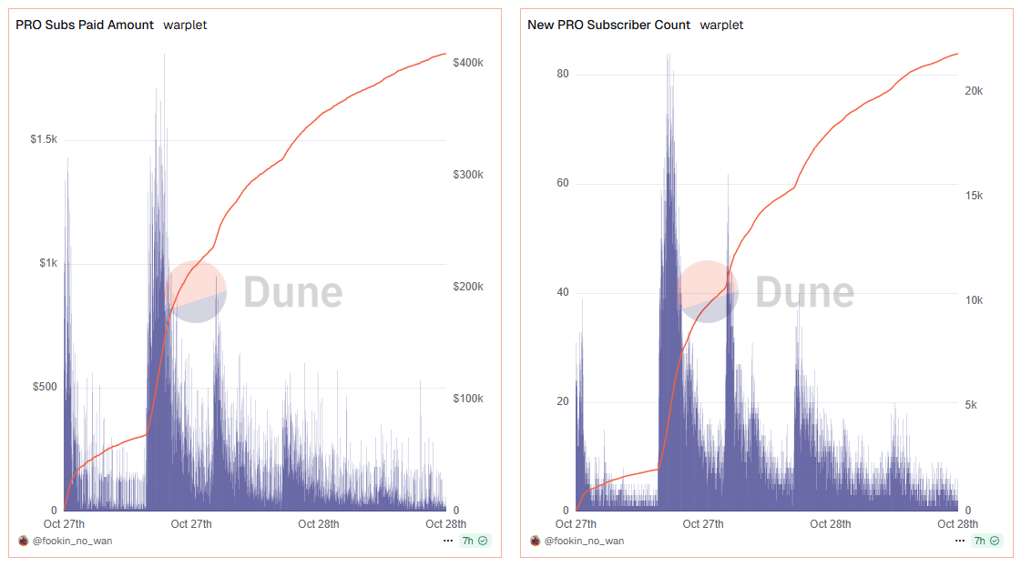 Yesterday, Oct. 27th, Farcaster reached a new all-time high in daily active users. And over the past 24 hours, the onchain social network saw +20,000 new Pro subscription purchases, amounting to +$400k in revenue, as people clamored in for Warplets eligibility.