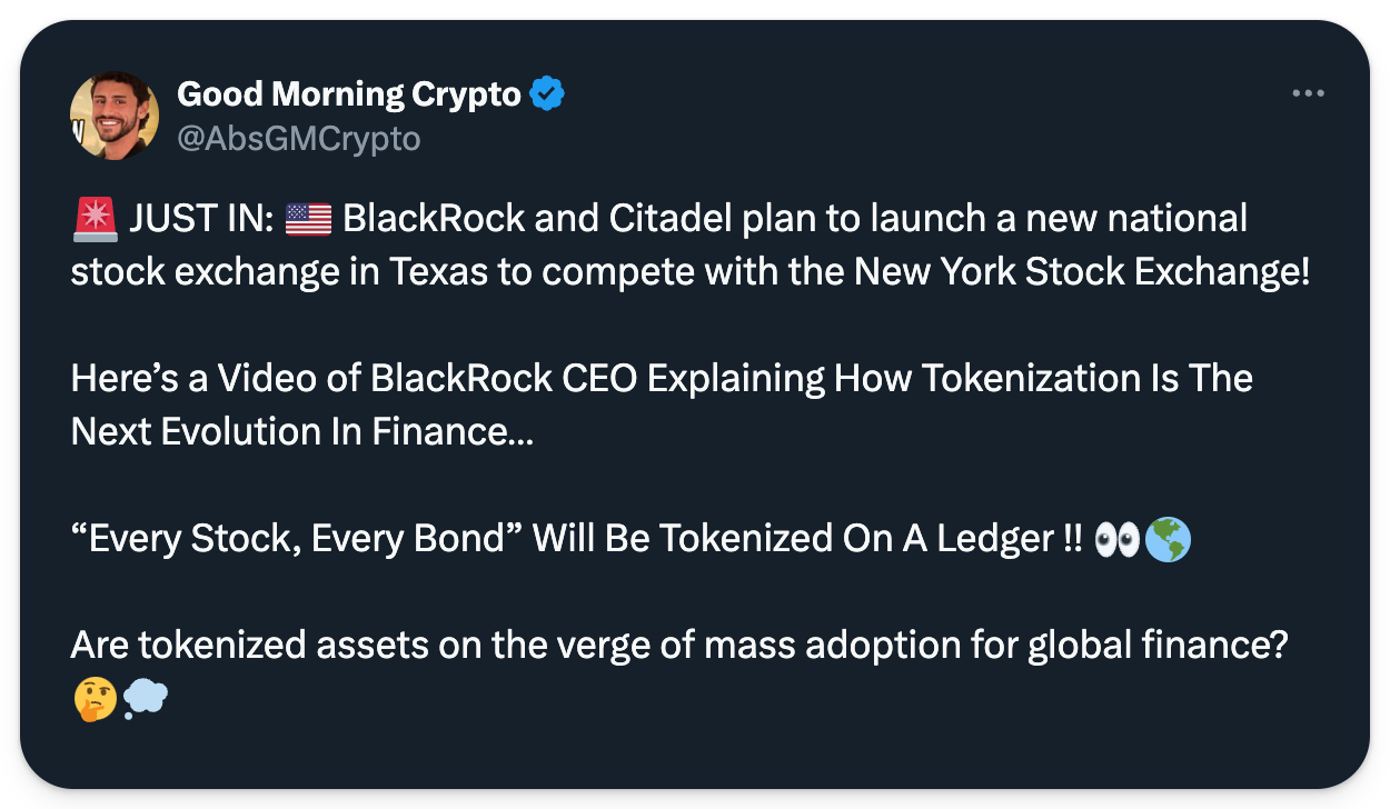 Crypto’s favorite asset manager, BlackRock, and market maker Citadel Securities have backed a firm launching a new national stock exchange in Texas. Having secured approximately $120M in funding, the Texas Stock Exchange (TXSE) intends to file registration with the SEC by the end of 2024. This move offers an alternative for crypto companies looking to go public, like Kraken, in a pro-crypto state. The TXSE will focus on securing ETF listings, providing more competition for the NYSE and Nasdaq, which could lead to lower fees for companies. The news comes as the SEC recently approved spot Ether ETFs in the United States, with a forecast of launching possibly as soon as the end of June.
